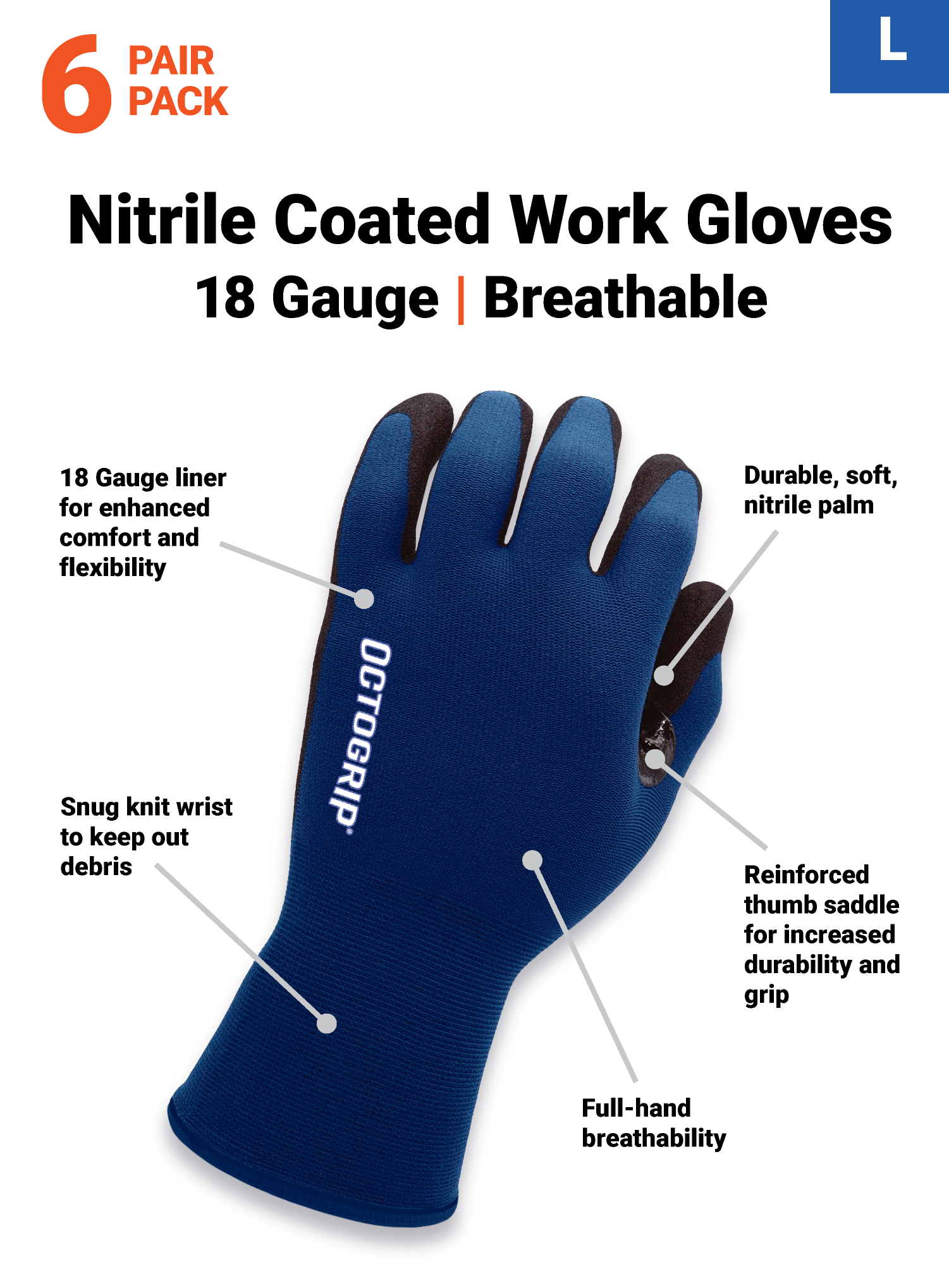 range of tasks.They come in a 6-pair value pack (3 pairs black, 3 pairs blue) and are available in sizes M, L, and XL.